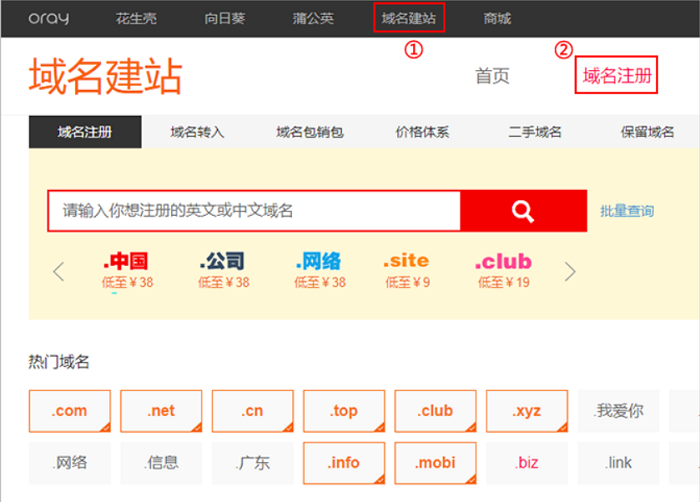 1、进入贝锐官网,点击【域名建站】——【域名注册】,在域名注册下面的文本框输入要注册的域名的前缀,在“热门域名”选择后缀,点击文本框后面的"查询",只要域名未被注册,在查询结果对应域名后面都会有一个“立即注册”的按钮。