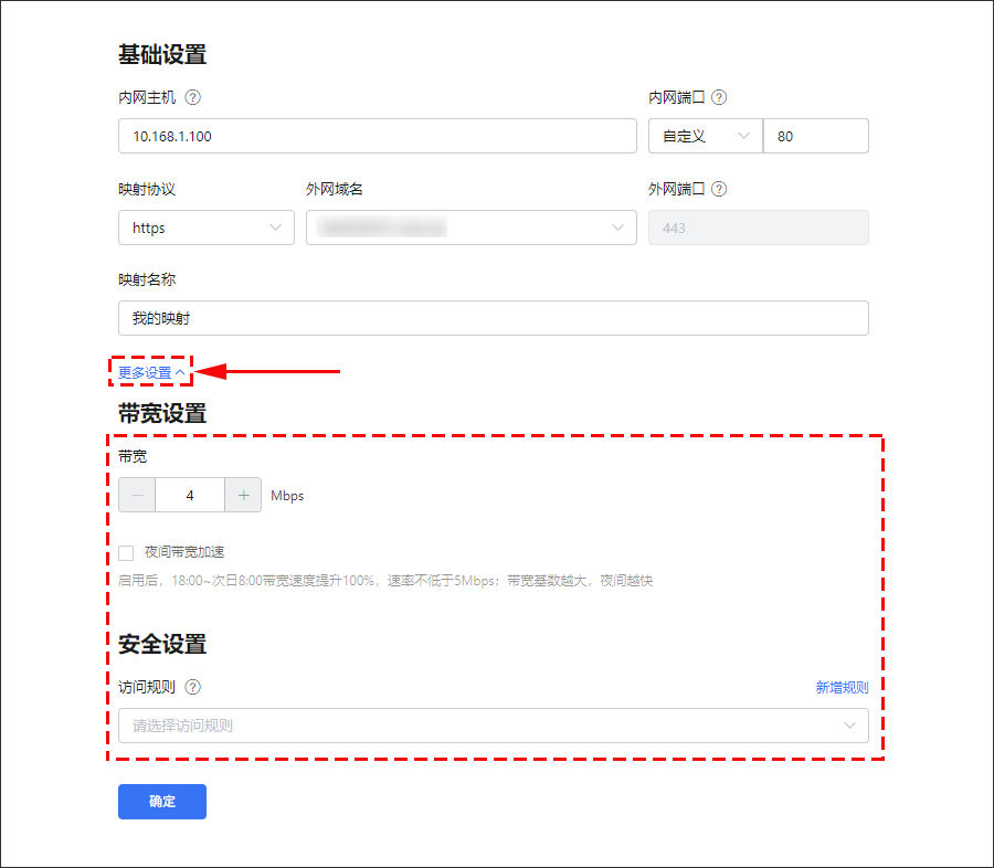 若有带宽或安全需求,可点击【更多设置】进行相关设置。