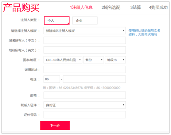 第三步:进入注册域名页面,填写相关的注册信息,然后点击下一步;